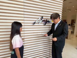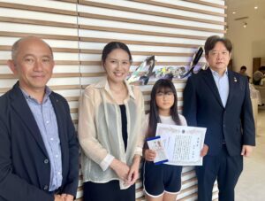 ヘアドネーション2025.09.06活動報告 市民安全委員会より8月31日に今期2回目のヘアドネーションに立ち会いました。 今回は高千帆小5年生の岡田七海さんです。松山会長から感謝状を渡しました。今回いただいた髪は大阪のつな髪というところへ送って小児がんのためにウィックが必要なかたへ使われます。 ご協力いただき本当にありがとうございました。 前の記事 4クラブ合同例会 2025.08.25次の記事 9月第一例会 2025.09.07